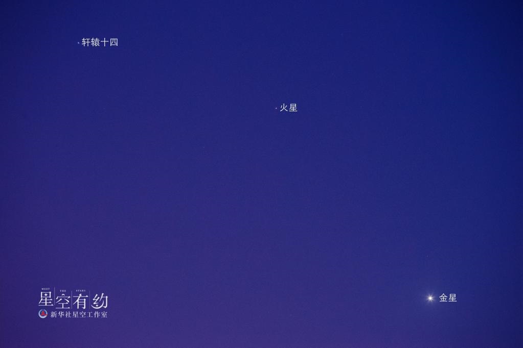 本次相合,火星與軒轅十四最近時僅有0.7度,就比一個滿月視直徑(約為0.5度)大一點,不過受日光影響,無法看到它們相距最近時的情景。好在當天20時左右,兩星近距離爭輝的場景在漸黑的暮色中依然會呈現(xiàn),感興趣的公眾可以嘗試觀測。