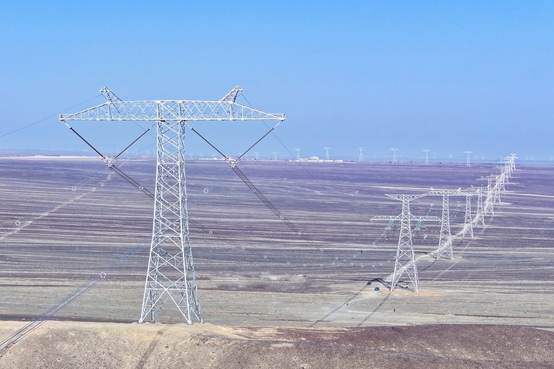 矗立在戈壁上的±800千伏哈密—重慶特高壓直流輸電線路工程(4月8日攝,無(wú)人機(jī)照片)。