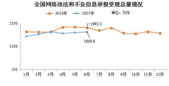 中新網(wǎng)7月9日電 據(jù)“中央網(wǎng)信辦舉報中心”微信公眾號消息,2025年6月,中央網(wǎng)信辦舉報中心指導全國各級網(wǎng)信舉報工作部門、主要網(wǎng)站平臺受理網(wǎng)民舉報色情、賭博、侵權、謠言等違法和不良信息1849.6萬件,環(huán)比增長1.1%、同比下降7.2%。其中,中央網(wǎng)信辦舉報中心受理舉報39.8萬件,環(huán)比下降9.5%、同比下降15.1%;各地網(wǎng)信舉報工作部門受理舉報63.7萬件,環(huán)比增長6.6%、同比下降50%;全國主要網(wǎng)站平臺受理舉報1746.1萬件,環(huán)比增長1.2%、同比下降4%。
