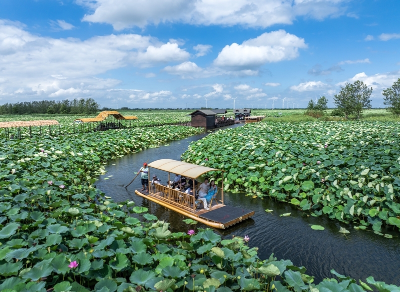 7月26日,游客在江蘇省興化市萬畝荷塘景區(qū)賞荷游玩(無人機(jī)照片)。