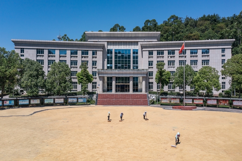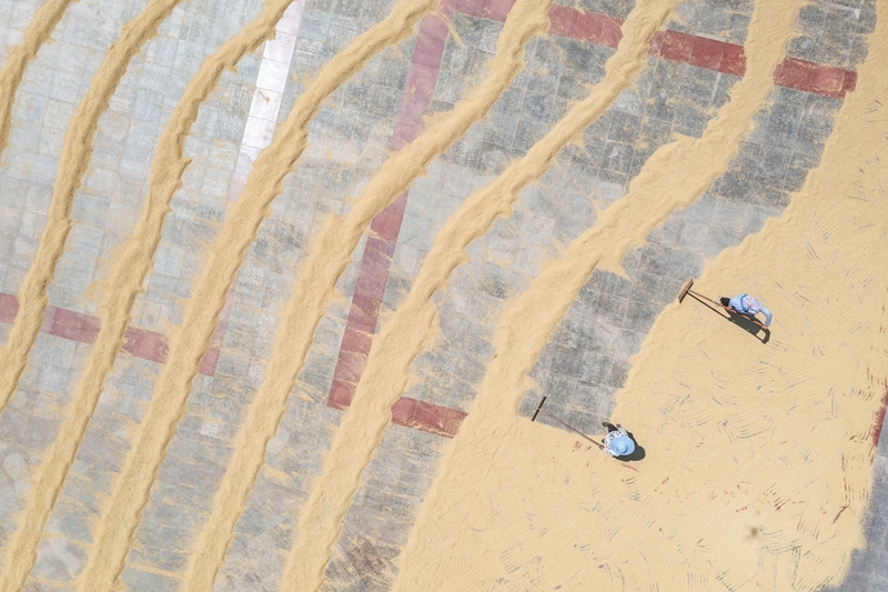 8月20日,人們?cè)谥貞c市永川區(qū)紅爐鎮(zhèn)政府廣場上晾曬糧食(無人機(jī)照片)。