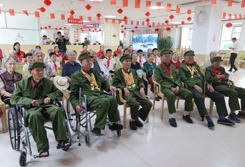 9月3日,在位于山東省臨沂市沂南縣大莊鎮(zhèn)的“山東抗戰(zhàn)老兵照護中心”,老兵們和志愿者、少先隊員一起觀看紀(jì)念中國人民抗日戰(zhàn)爭暨世界反法西斯戰(zhàn)爭勝利80周年大會直播。
