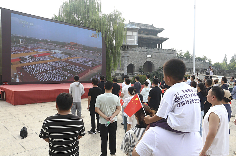 9月3日,游客在山東省棗莊市臺兒莊古城西門觀看紀(jì)念中國人民抗日戰(zhàn)爭暨世界反法西斯戰(zhàn)爭勝利80周年大會直播。