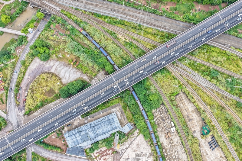 9月8日,滿載“重慶造”汽車的中歐班列(成渝)在重慶團(tuán)結(jié)村中心站順利發(fā)車(無人機(jī)照片)。
