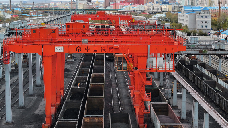 10月18日,在中國鐵路哈爾濱局集團有限公司滿洲里站,機械化換裝場在對進口貨物進行換裝作業(yè)(無人機照片)。