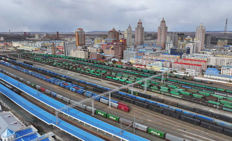 10月18日,在中國鐵路哈爾濱局集團有限公司綏芬河站南場,滿載進口貨物的列車等待解體換裝(無人機照片)。
