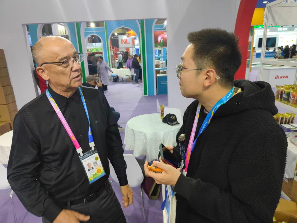 2025年10月24日,塔吉克斯坦杏和公司負(fù)責(zé)人普洛特·阿舒羅夫(左)介紹自己參加第32屆中國楊凌農(nóng)業(yè)高新科技成果博覽會(huì)的相關(guān)情況。新華社記者 姚友明 攝