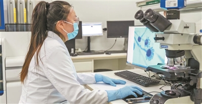 天津市腫瘤醫(yī)院空港醫(yī)院醫(yī)務人員在化驗樣本。