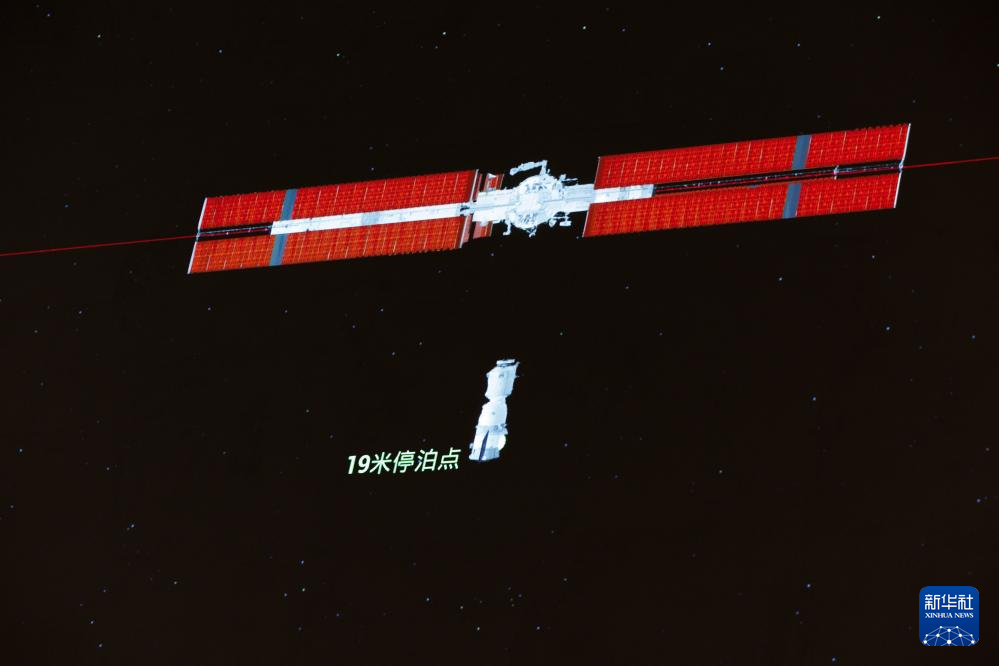 4月24日在北京航天飛行控制中心拍攝的神舟二十號(hào)載人飛船成功對(duì)接空間站天和核心艙的模擬畫面。新華社記者 金立旺 攝