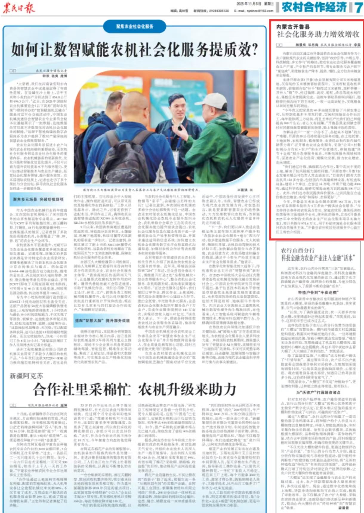 2025年11月5日,《農(nóng)民日報(bào)》第7版刊發(fā)題為《內(nèi)蒙古開魯縣:社會化服務(wù)助力增效增收》的文章,報(bào)道了今年以來,內(nèi)蒙古開魯縣玉米社會化服務(wù)面積182萬畝,共有132家各類服務(wù)組織為3萬多農(nóng)戶提供社會化服務(wù)。