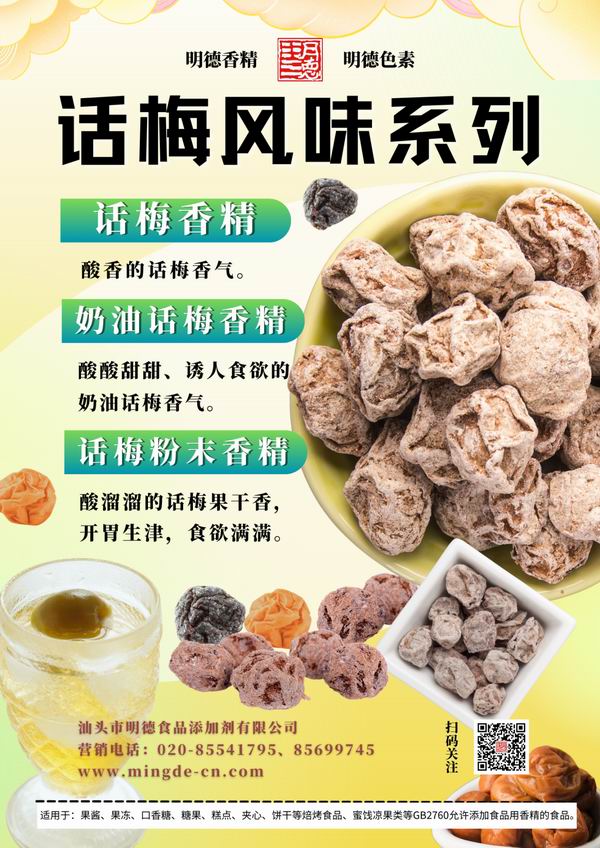 在梅子風(fēng)味香精領(lǐng)域我們數(shù)十年潛心專研,迎合市場需求,滿足消費者喜好,汕頭市明德食品添加劑有限公司,推出了多種款梅子風(fēng)味香精,如:青梅風(fēng)味、酸梅風(fēng)味、話梅風(fēng)味、酸梅湯風(fēng)味等。