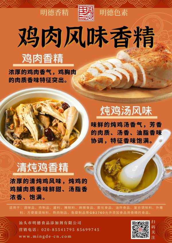 在雞肉香精領域我們潛心專研,結合市場潮流,消費者喜好,汕頭市明德食品添加劑有限公司現有以下16種雞肉相關風味的香精,供您選擇。并持續(xù)努力研發(fā)更多符合市場需求的風味。