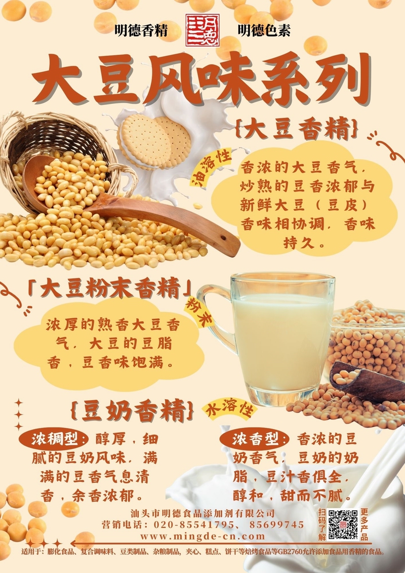 如需獲取不同版本風味樣品或配方方案,歡迎聯(lián)系明德團隊。我們致力于為食品工廠提供真實、安全、高性價比的香精解決方案。汕頭市明德食品添加劑有限公司推出的大豆風味系列香精,覆蓋大豆香精、大豆粉末香精、豆奶香精等多種調(diào)性,風味真實,留香穩(wěn)定,適用于膨化休閑、復合調(diào)味、豆制品及飲料等B端工廠,幫助快速打造具有記憶點的大豆類風味。